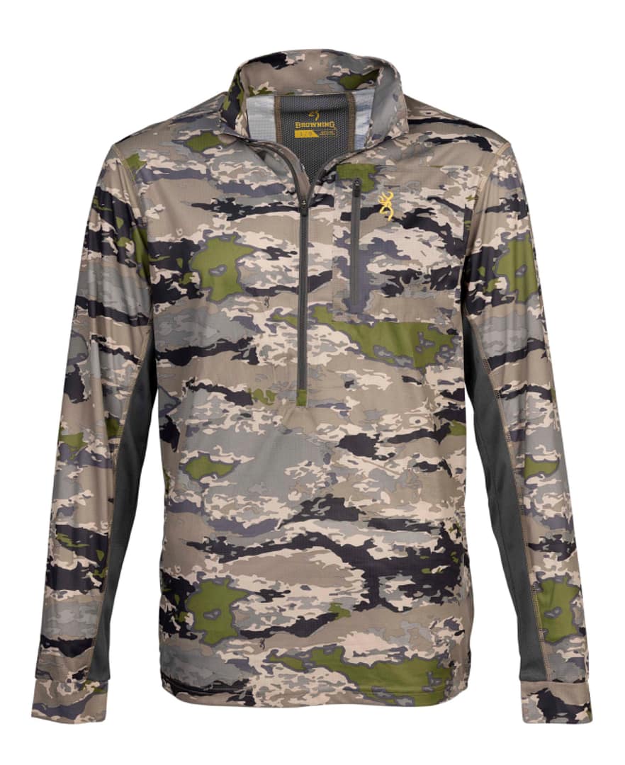 Long sleeve shirt for early season big game hunting. Features lightweight polyester fabric with mesh panels under arms and across back. Deep 3/4 zip front zipper and tall collar. 50+ UPF protection.